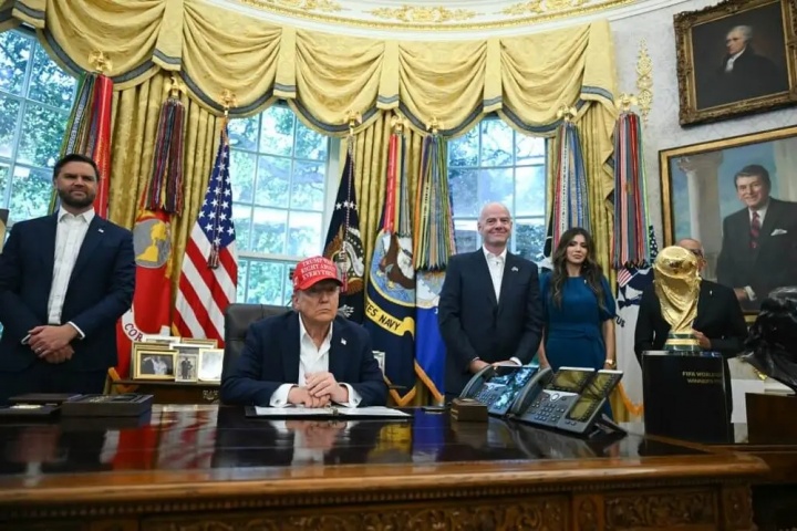 副总统JD-万斯(左一)、国际足联主席詹尼-因凡蒂诺(右二)与国土安全部长克里斯蒂-诺姆(右一)共同出席发布仪式。