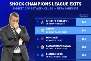 体育资讯8月28日讯 欧冠附加赛次回合,凯尔特人在点球大战中不敌阿拉木图凯拉特,目送对手队史首次闯进欧冠正赛。根据德国转会市场的统计,凯尔特人本次被淘汰是欧冠历史交锋两队欧足联积分差距第二大。