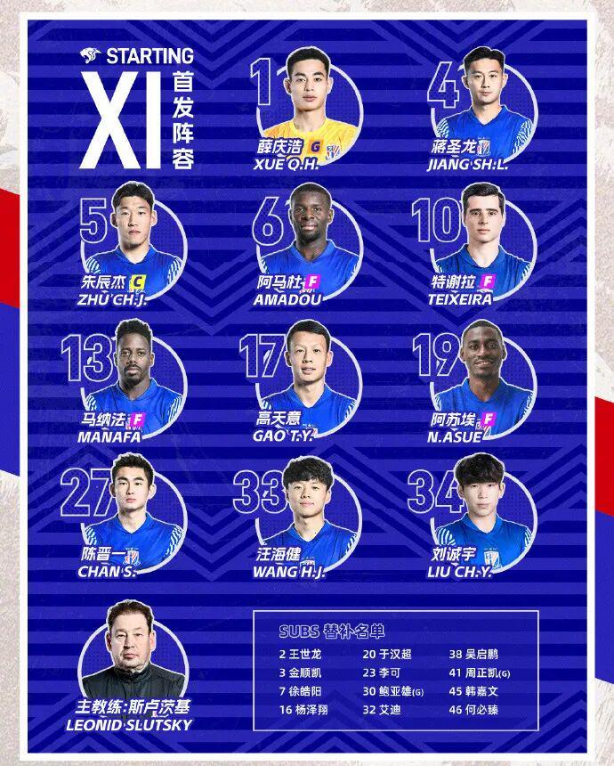 本场比赛上海申花首发:1-薛庆浩、4-蒋圣龙、5-朱辰杰、13-马纳法、27-陈晋一、17-高天意、6-阿马杜、33-汪海健、10-特谢拉、19-阿苏埃、34-刘诚宇
