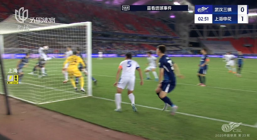 开场仅仅1分半钟,上海申花就利用定位球机会,高天意将球开到禁区后点,朱辰杰将球做回禁区中路,阿苏埃后点将球撞入球门,不过裁判通过VAR认定,阿苏埃手球犯规,进球被取消。