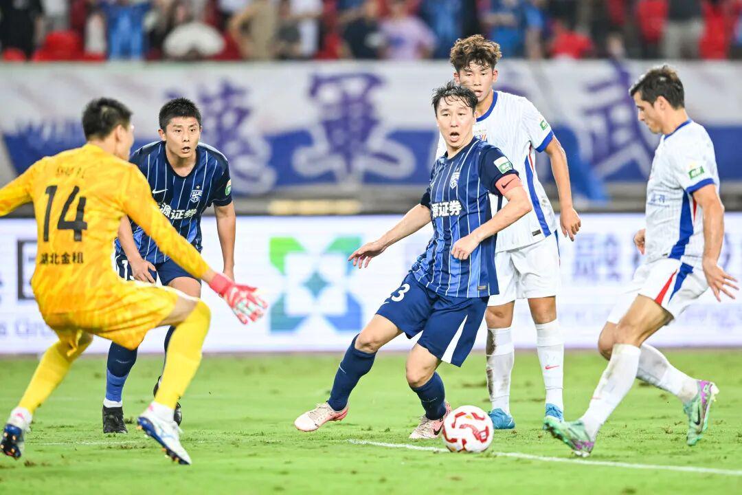 第22分钟,武汉三镇一次反击机会,薛庆浩出击导致禁区大片开阔地,好在邓涵文的攻门被横梁拒绝。