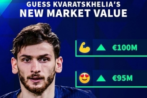 体育资讯6月3日讯 德国转会市场更新社媒动态,预热克瓦拉茨赫利亚身价上涨。