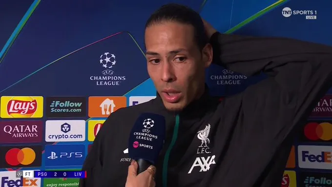 虎扑04月09日讯 利物浦队长范戴克在0-2输给巴黎圣日耳曼的欧冠首回合赛后,接受TNT Sport瞬采。